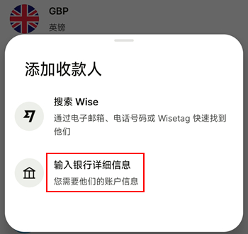 之后是“添加收款人”,这里选择“输入银行详细信息”