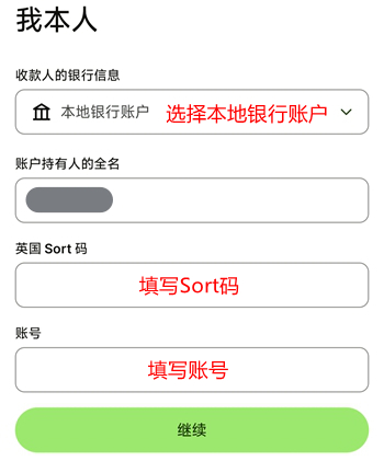 之后是填写你的收款银行🏦信息,“收款人的银行信息”这里选择“本地银行账户”,账户持有人的全名,这里默认就是你本人姓名(拼音),系统已经帮你填好了,不用修改。英国Sort码和账号需要登录你的iFAST GB查看