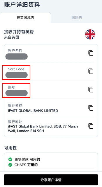 然后登录你的iFAST银行,可以看到你的账号详细信息,把你的Sort码(英国银行的本地清算代码,仅用于英国的国内转账,6位数)和账号(8位数)复制黏贴到Wise的收款人银行信息中,就可以继续下一步了