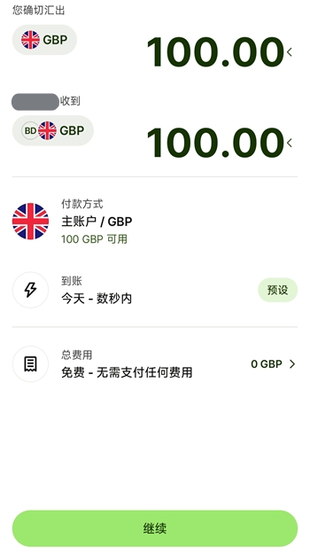 然后输入汇出金额,我这里测试的是100英镑,你可以看到收到的就是100英镑,在Wise汇款操作中,你可以看到到账金额和手续费都会有显示
