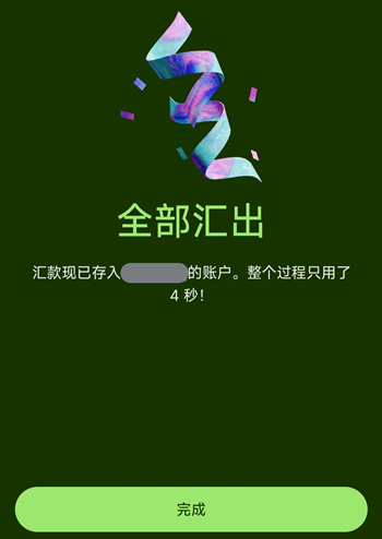 最后会让你输入Wise的密码,你的英镑就汇出了,可以看到只花了4秒钟,就已经成功汇款到你的iFAST银行账户了