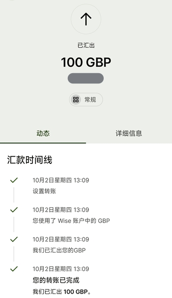 在Wise中,也会显示这笔汇款的时间线,实际操作下来就是秒到账的,而且还是0手续费