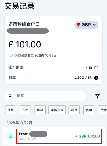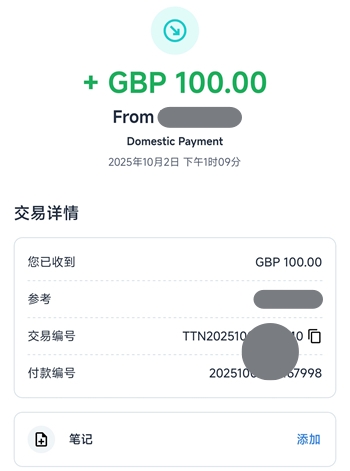 在iFAST GB中,你能看到到这笔汇款的交易详情,可以看到,iFAST银行的到账时间和和Wise的汇款时间是同一时间,iFAST银行的到账金额也和Wise的汇款金额一致,当中没有任何手续费